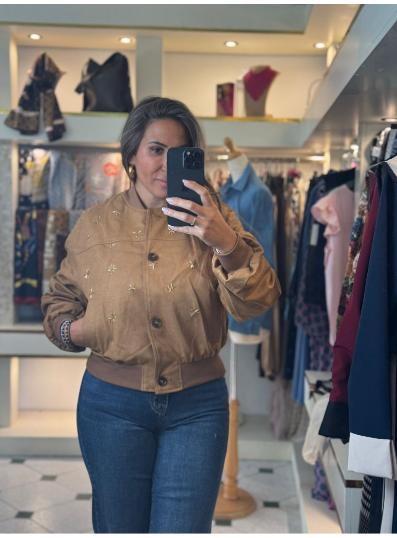 Bomber con detalle de strass, de ante de alta calidad y forrada. Talla única (tallan de la S a la XL, hasta la 42).