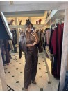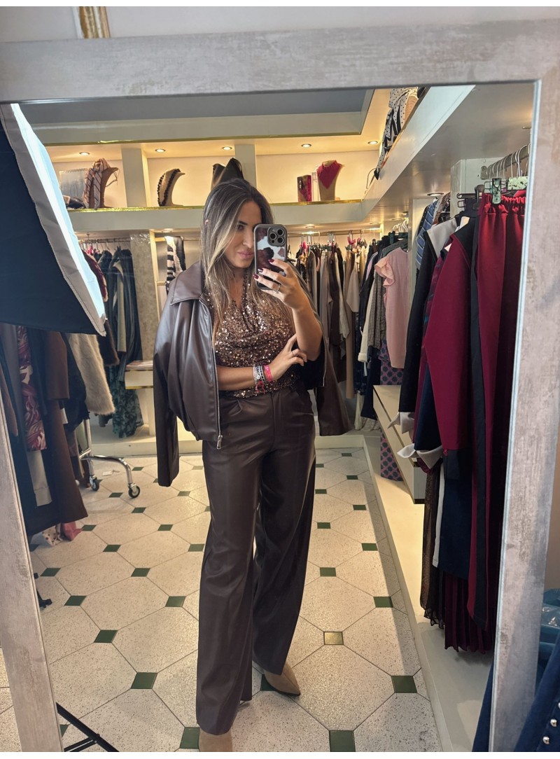 Pantalón polipiel detalle de cintura y recto en color marrón chocolate.